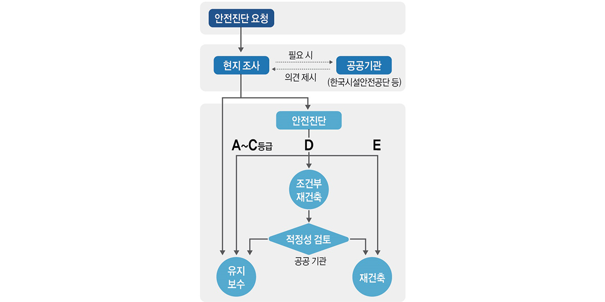 공동주택의 구조안전성 및 주거환경 중심 평가 안전진단의 경우 주거환경, 건축마감 및 설비노후도, 구조안전성, 비용분석의 결과를 종합하여 유지보수, 조건부 재건축, 재건축으로 구분하여 판정한다.